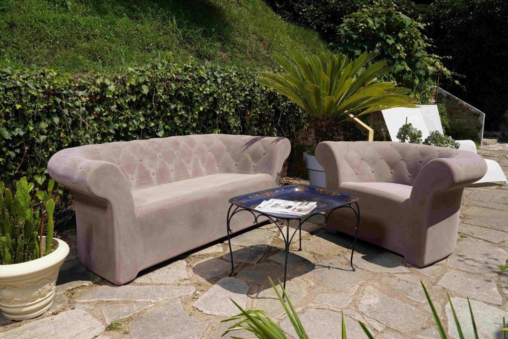 El concepto inicial era muy claro: crear sofás de exterior cómodos y funcionales. La sinergia entre diseño y forma fue posible gracias a la experiencia de la firma Serralunga, que, mediante tecnología rotacional, creó una forma evocadora que conserva las características distintivas, como el efecto acolchado, del sillón inglés original.